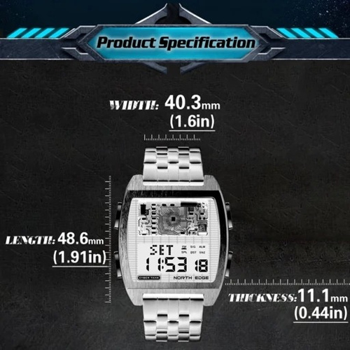 ساعت دیجیتال نورث ادج مدل Cyber Tank، یکی از مدلهای پرفروش برای طرفداران طرحهای مستطیلی است. برای طراحی این محصول از مدلهای قدیمی ساعت ایدهبرداری شده که در آن شاهد یک صفحه نمایش مستطیلی با بندی فلزی و در عین حال منعطف خواهیم بود. برای نمایش ساعت و تقویم میتوانید روی این مدل حساب کنید. همچنین طراحی آن به گونهای است که برای استفاده در کنار استایلهای اسپرت آقایان مناسب به نظر میآید.